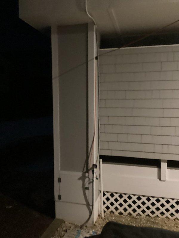 Conducted an estimate for replacement of an HVAC system serving the first and second floors with air handler located in garage. Inspected existing outdoor units housed within white lattice enclosure, noting aged condensers with visible wear and dirt accumulation on exterior fins.