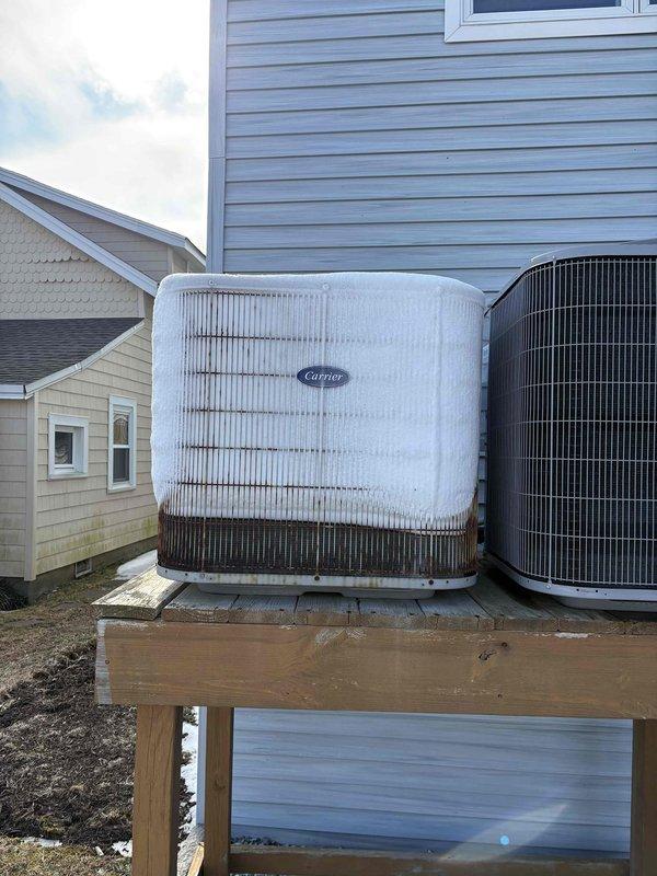 Responded to no heat call for downstairs system (Carrier). Discovered unit completely frozen with ice buildup on outdoor condenser. Diagnosed refrigerant leak causing system freeze-up. Performed defrost cycle, sealed leak at evaporator coil connection, and recharged system with proper refrigerant level. System now operating within normal parameters with proper heating function restored.