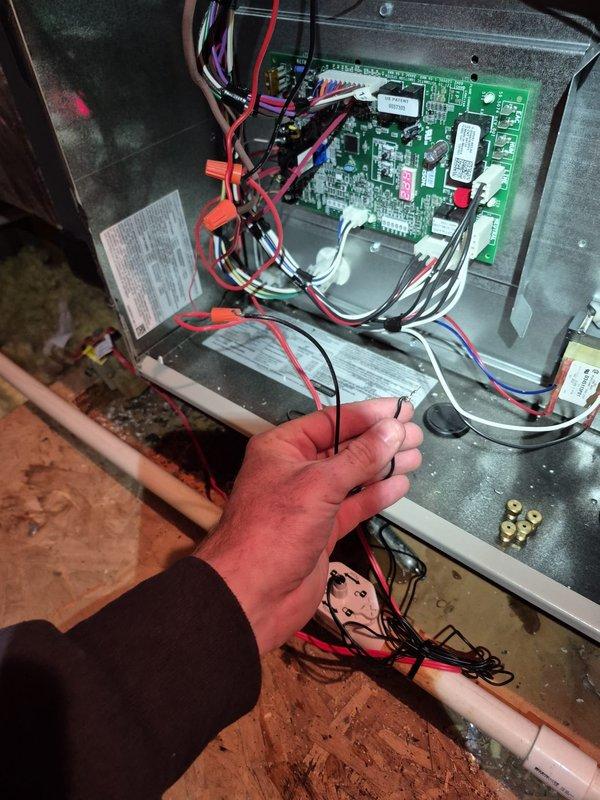 Responded to no heat complaint at rental property. Inspection revealed faulty electrical connections at the control board junction box. Repaired damaged wiring at the thermostat terminals and restored proper circuit continuity, successfully returning heating system to normal operation.