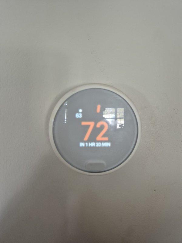 Responded to no heat call on system less than 10 years old. Upon arrival, found thermostat set to 72°F with indoor temperature reading 62°F and system not activating. Verified air filters were clean and confirmed thermostat programming showing delayed start time. Checked system operation and determined unit was functioning properly but set on a programmed schedule, causing the delayed activation displayed as "IN 1 HR 20 MIN" on smart thermostat. Educated customer on thermostat scheduling features and adjusted settings for immediate heating operation.