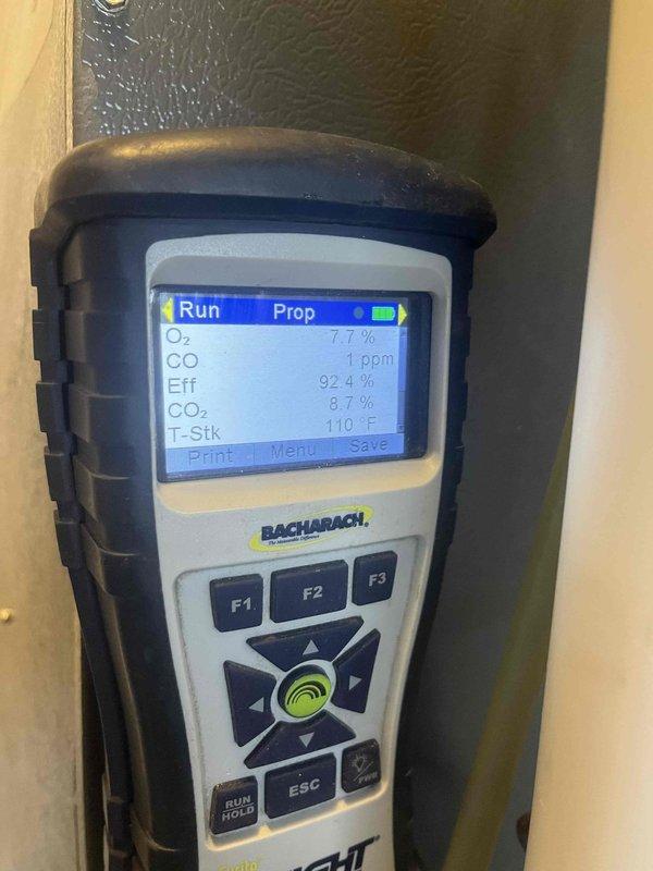 Performed scheduled heating maintenance service and conducted combustion analysis using Bacharach analyzer. System operating with excellent efficiency (92.4%), optimal oxygen levels (7.7%), and safe CO readings (1 ppm). Stack temperature measured at 110° with CO₂ at 8.7%, confirming proper combustion parameters.