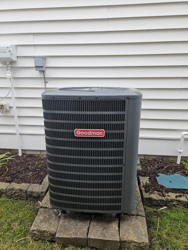 Performed routine cooling system tune-up on Goodman outdoor condensing unit. Inspected system operation, confirmed proper refrigerant levels, and verified the customer had recently replaced air filters. System functioning within normal parameters with no issues detected.