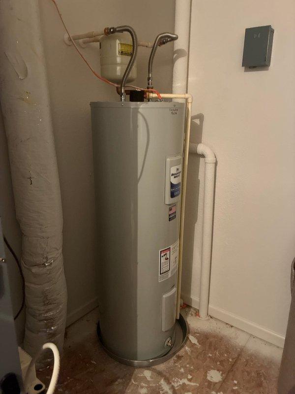 Installed a 50-gallon tall residential water heater (model RE250T61) in utility room with complete plumbing connections and safety components. Installation included expansion tank, 22-inch drain pan, dual 18-inch flexible connectors, and various brass fittings including nipples, tee, and 90-degree elbow with high-temperature male adapter. Unit was properly staged, connected to existing water supply lines, and tested for proper operation with all required code-compliant safety devices in place.
