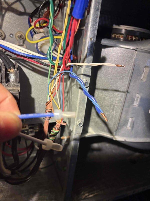 Responded to a no-heat call for a system less than 10 years old that was not maintaining set temperature. Upon inspection, identified loose electrical connections in the control board wiring. Repaired and secured all electrical connections, particularly focusing on the blue wire that had become disconnected from its terminal. System now operating correctly and maintaining proper temperature.