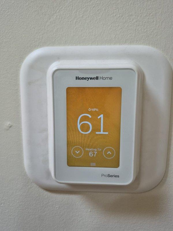 Responded to no heat call and found Honeywell Home ProSeries thermostat calling for heat with setpoint at 67°F while space temperature was 61°F. Investigated heating system, identified and resolved issue, and verified proper system operation with thermostat successfully controlling heating equipment to reach desired temperature.